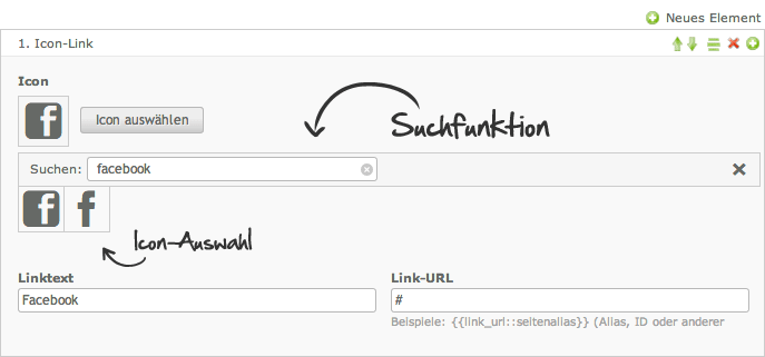 Wählen Sie aus über 300 Icons, die passenden Symbole für Ihre Inhalte. Alle Icons lassen sich mit Hilfe des RockSolid Icon Picker mit einem Klick Elementen zuweisen und bequem editieren.